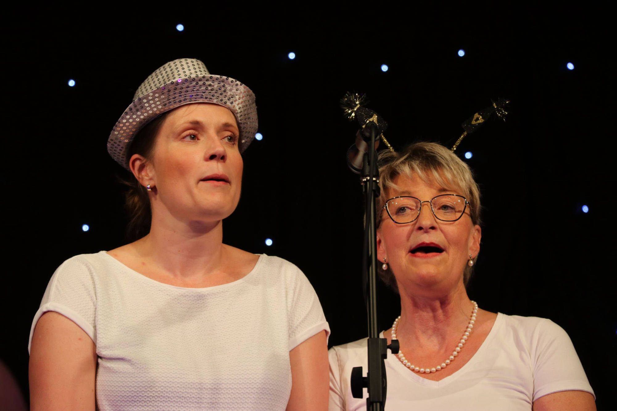 Schlaf, Liebe, Einsamkeit und Feiern zogen sich wie ein roter Faden durch die nun folgende Veranstaltung. Die Bühne war mit Sternenhimmel und farblich abgestimmten Licht vorbereitet, die Choreographie aufwändig einstudiert. „Sandmann, lieber Sandmann“ bildete, vom Pubikum gesungen, den Auftakt. Nun war klar: Der Schlafsand ist nicht weit. „The Lion sleeps tonight“, „Memory“, „Blue Moon“ und „Tourdion“ waren einige der nun dargebotenen Klassiker. Chorleiterin Imke Ortmann, am Piano hervorragend unterstützt durch Maike Jensen, bezog bei einzelnen Liedern, sowie zwischendurch, auch das Publikum weiter mit ein. Immer wieder wurde das Lied „Der Mond ist aufgegangen“ aufgegriffen, bis am Ende alle sieben Strophen gesungen waren. Bei den Liedern, hauptsächlich aus den Bereichen Oper, Pop und Musical, gab es mehrere Soloparts, welche die Zuhörenden besonders begeisterten. Insgesamt war es für aktiv und passiv Teilnehmende der Veranstaltung ein gelungener, schöner Abend.