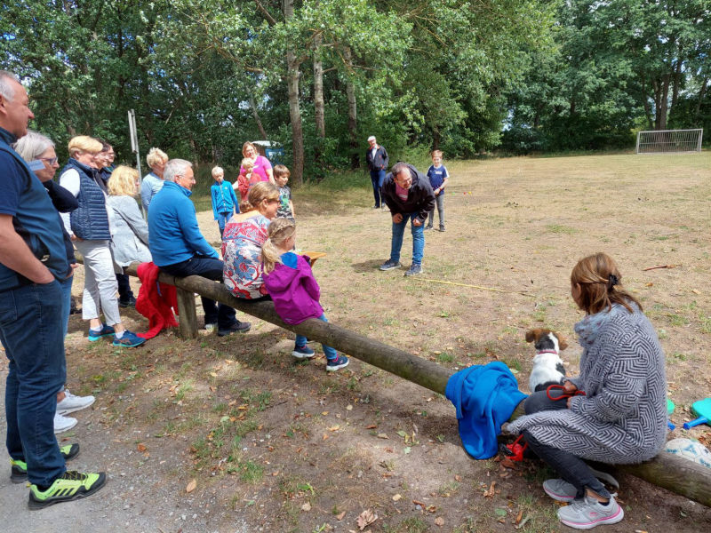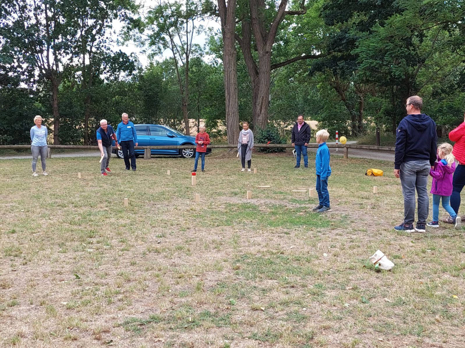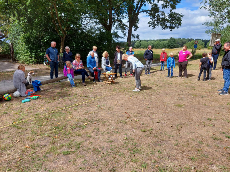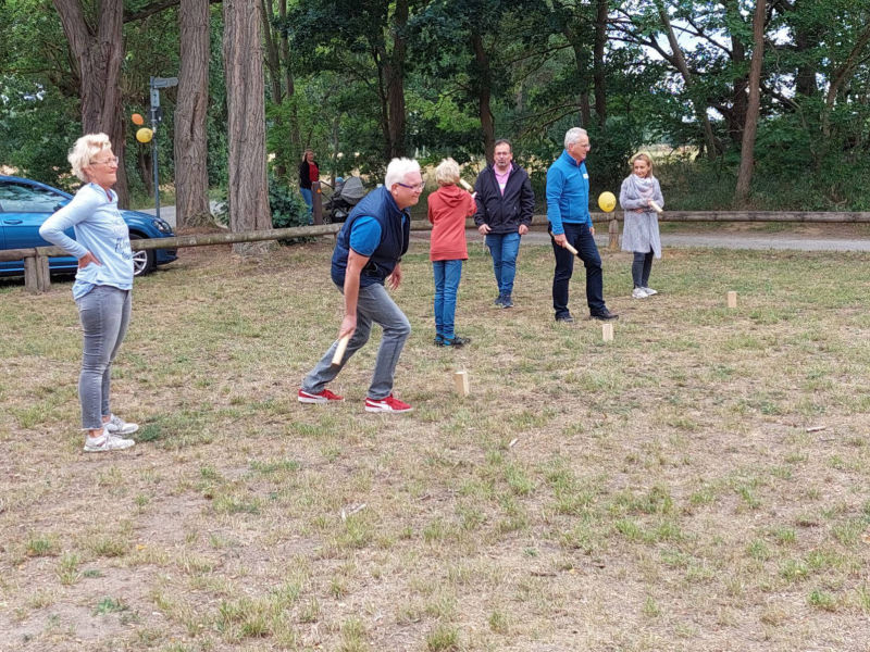 Nach der Begrüßung ging es auf die große Wiese, auf der verschiedene Geschicklichkeits- und Teamspiele aufgebaut waren. Gestartet wurde mit Teebeutelweitwurf. Hierbei wird der vorab in Wasser getränkte Teebeutel am Papier in den Mund genommen und mit viel Schwung und Körpereinsatz so weit wie möglich geschleudert. Die Ergebnisse reichten von minus 20 cm bis hin zu unglaublichen 4,90 m. Aber ganz unabhängig davon wurden die Lachmuskeln ordentlich strapaziert. Im Anschluss teilte sich die Gruppe an den verschiedenen Stationen auf. Beim Croquet ging es darum, einen Ball mit so wenig Schlägen wie möglich durch kleine Torbögen zu schlagen, beim Wikingerschach möglichst schnell die Figuren des Gegners mit einem Wurfstock umzuschmeißen und beim Leitergolf zwei Bälle am Band so zu werfen, dass sie sich um die Sprossen der „Leiter“ wickeln und hängen bleiben. Insbesondere die Kids tobten sich zudem beim Fußball, Frisbee und mit den drei anwesenden Hunden ordentlich aus.