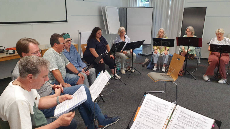 Das intensive Proben wurde von kleineren Pausen unterbrochen. In den jeweiligen Stimmlagen wurde sich auch schon mal zurückgezogen und eigenständig geprobt, um es anschließend wieder zusammenzuführen.